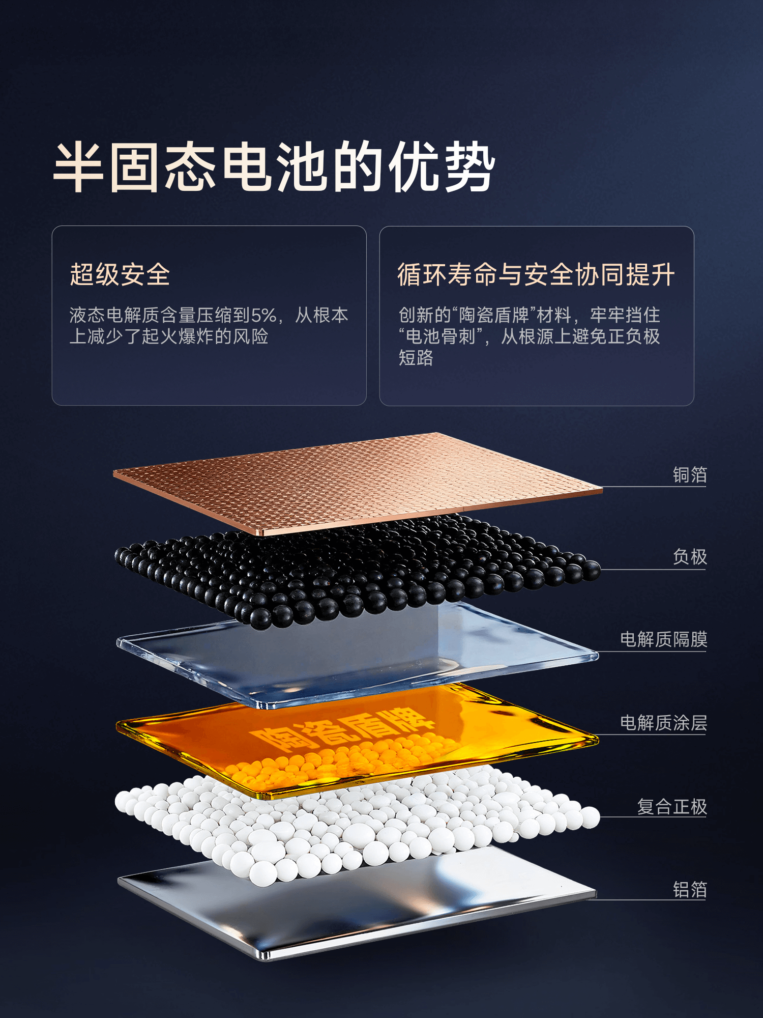 ✅半固态电池内置创新的“陶瓷盾牌”材料,强力阻挡锂枝晶,杜绝内部短路
