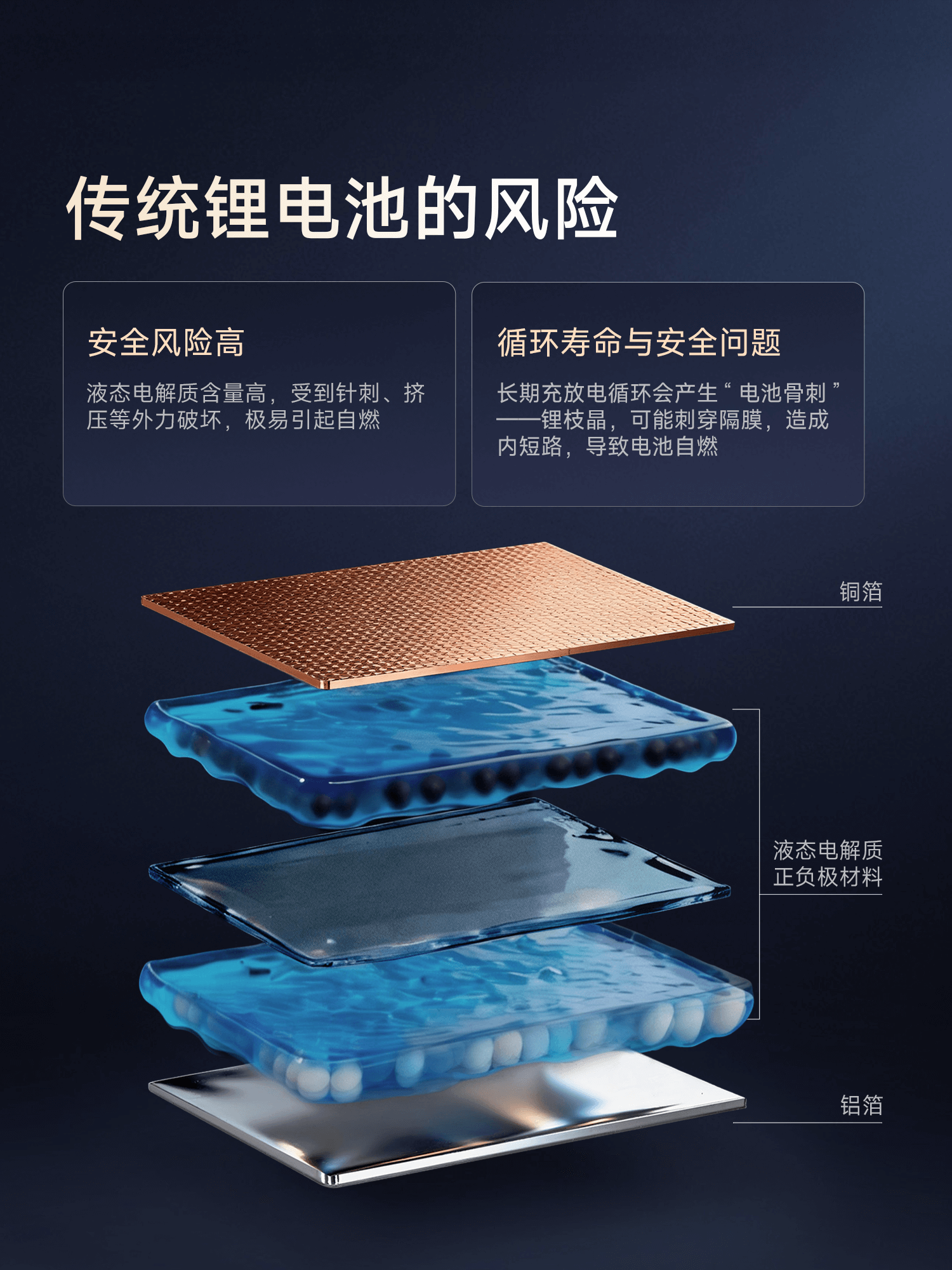 ❌传统锂电池长期充放电循环会产生锂枝晶,可能刺穿隔膜,造成内短路,导致电池自燃
